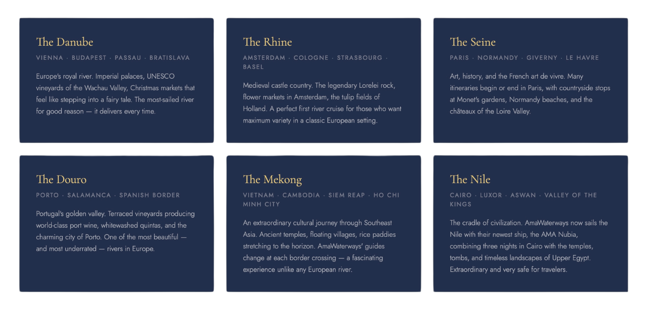 Each river has its own character, its own pace, its own magic. We’re here to help you choose the best one for you.